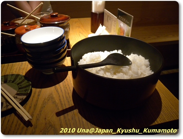 接著,女服務生送上了一小桶白飯。她非常親切地告訴我,如果白飯吃完可以再添。但是她認為我們是外國人,可能聽不懂,又再說明了一次。我這時候靈光乍現,頭上冒出一顆燈泡,噹!我問她:「食べ放題?」(吃到飽嗎?) 她馬上瞪大眼睛,笑瞇瞇地猛點頭,對我豎起大拇指,幫我按了一個『讚』!