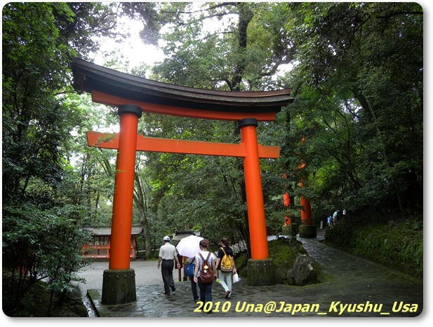 進入神宮境內,蟬鳴大譟不絕於耳,呼應著炎炎夏日;樹林茂密蓊鬱,芬多精充滿在每口呼吸的空氣裡;野鴨悠遊地在境內漫步,池塘裡的荷花盛開,河川裡的鯉魚活蹦亂跳,小蜘蛛恣意地在任何一處結網...。這一切,令人感覺在這裡時光流逝緩慢,除了寺廟的紅漆因歲月而褪色外,彷彿一千多年前和現在的景致並沒有多大改變,人類在這裡只不過是短暫的過客,我想,這些就是『宇佐神宮』最大的魅力。妹妹法蘭甚至有感而發:「希望這裏不要因為開發而被觀光客淹沒。」